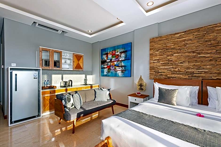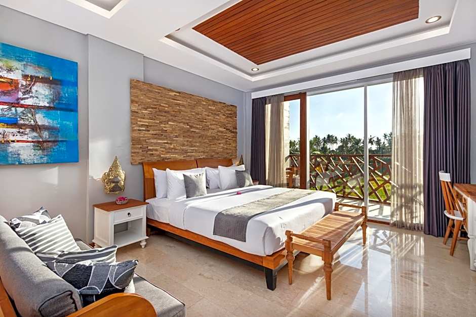 This suite features a balcony, living room, kitchenware and dining area.